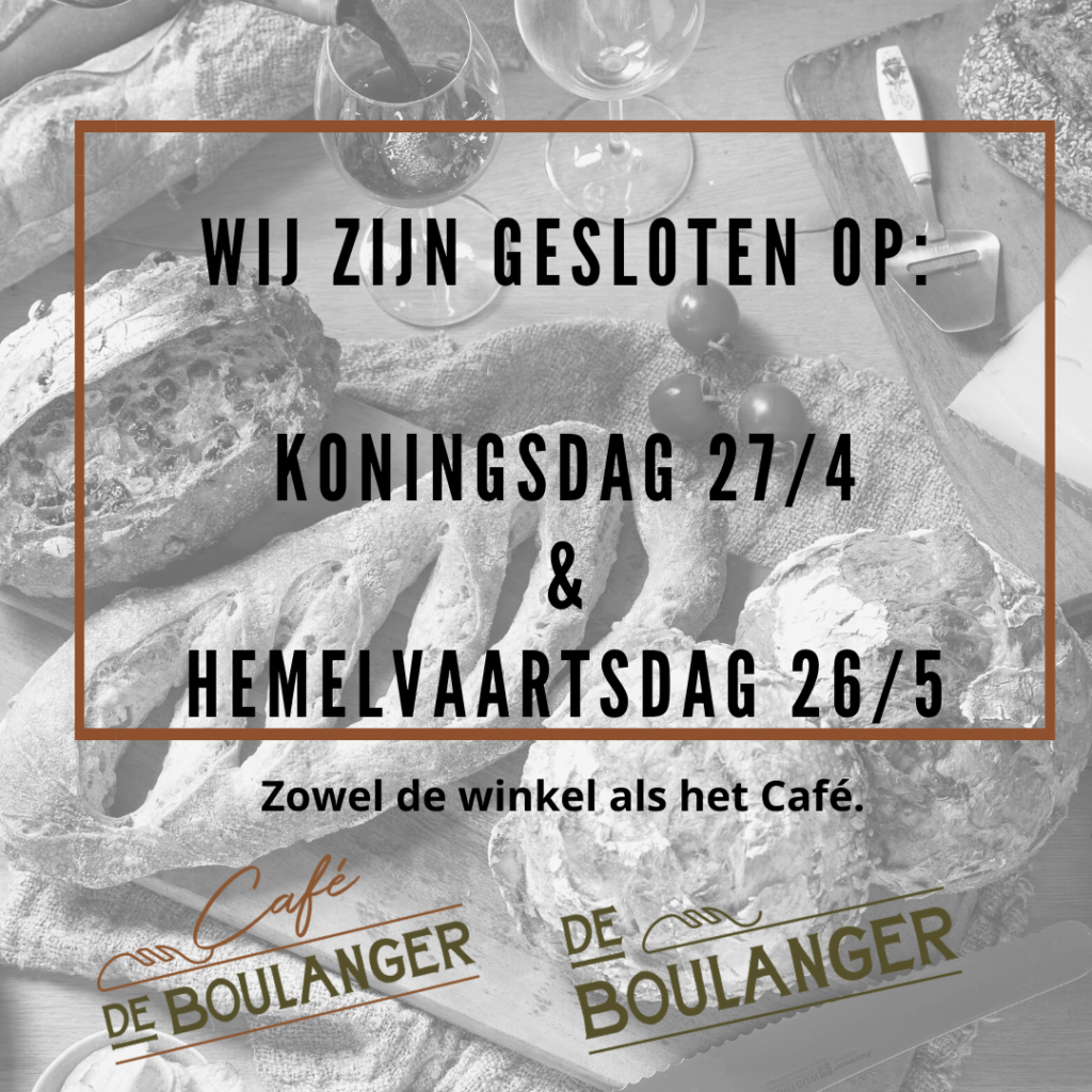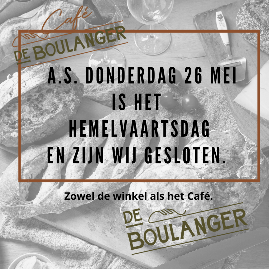 a.s. Donderdag 26 mei is het Hemelvaartsdag en is De Boulanger gesloten. Dit geldt voor zowel de winkel als het Broodcafé. Vrijdag 27 mei zijn…