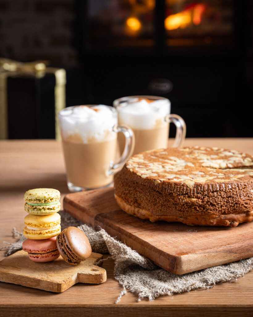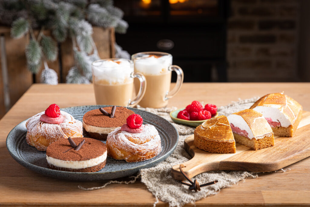 Kerstinspiratie voor bij de koffie: De Tourné Framboise met frambozenvulling of toch liever de Amaretto tiramisu met speculaasbodem? Daarnaast hebben we de Kerstslof: een crèmeaux…
